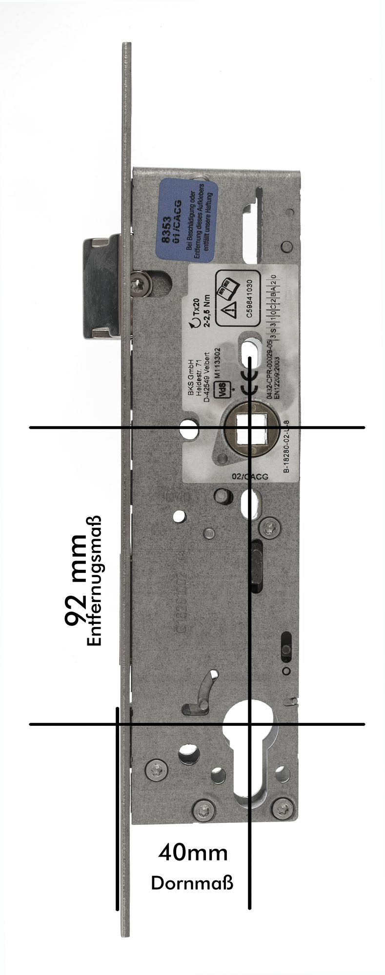 BKS Rohrrahmenschloss B-18280-02-U-8 92 mm Entfernung, 40 mm Dorn, Fachstulp 270x24x3 mm Falle umlegbar, 8 mm Nuss, Normalfunktion