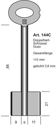 Guss Doppelbartschlüsselrohling mit Bohrung 3,8 mm, Gesamtlänge 110 mm, Halm ca. 6 mm